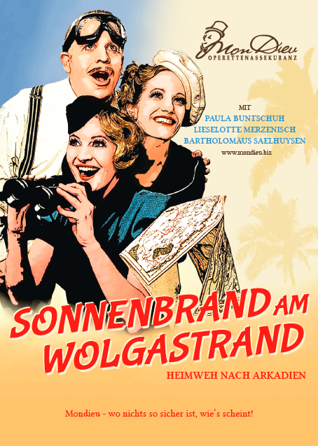 Wenn Ihnen der Duft von Nachbars Kohlsuppe schon zu lange in der Nase sticht, wenn Herr Krause das Plumpsklo im Parterre wieder mal verstopft hat und Sie Ihre Miederwaren in der Zugluft des Badezimmerfensters trocknen können, dann ist unsere neueste Police bestimmt das Richtige für Sie: Sonnenbrand am Wolgastrand –für alle Sehnsüchtigen und Fernwehkranken, für Sonnenanbeter und Polareisverehrer, im Frühling, Sommer, Herbst und Winter: Im Schlafcoupé nach Großberlin, im Luftballon ins Ungarnland und hoch zu Ross am Wolgastrand. Wir nehmen Sie mit auf die Reise, einmal um die Welt. Impfungen unnötig. Ach ja, bitte Ihre Westernstiefel nicht vergessen! Et parlez-vous francais? A little? Merviglioso!